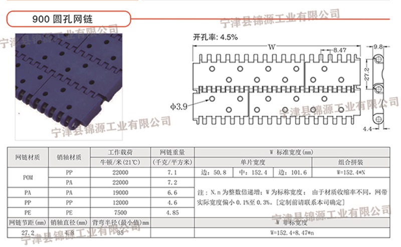 塑料網(wǎng)帶由鏈輪驅(qū)動(dòng),網(wǎng)帶節(jié)距主要有12.7mm、15.2mm、19.05mm、25.4mm、27.2mm、38.1mm、50.8mm、57.15mm,開(kāi)孔率2%-48%