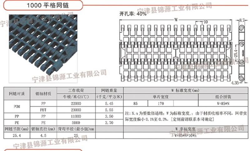 塑料網(wǎng)帶由鏈輪驅(qū)動(dòng),網(wǎng)帶節(jié)距主要有12.7mm、15.2mm、19.05mm、25.4mm、27.2mm、38.1mm、50.8mm、57.15mm,開孔率2%-48%